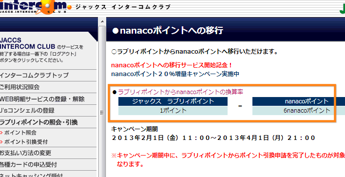 以前、ジャックスカードのラブリィポイント(ジャックスカードで支払うと、支払った額の1%がラブリィポイントとして貯まっていく)からnanacoポイントに交換すると、通常はラブリィポイント1ポイントあたりnanacoポイント5ポイントとして変換できるのですが、キャンペーンで6ポイントとして交換できる期間があって、貯まっていたラブリィポイントを全部nanacoポイントに交換したことがあるんです。